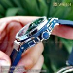 Dial & Display: The deep sunray-finished blue dial captures and reflects light with mesmerizing depth, embodying elegance and serenity. Applied rhodium-plated hour markers and faceted hands filled with white Super-LumiNova ensure precise readability in all lighting conditions. The minimalist three-hand layout and discreet date window at 3 o’clock maintain perfect balance and clarity. The dial’s refined tone contrasts beautifully with the brilliance of the diamond bezel, resulting in a look that is both sporty and luxurious—modern yet timeless.