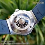 Case & Material: The HBL Big Bang Steel Blue Diamond embodies modern sport-luxury with an exquisite fusion of materials and brilliance. Its 41 mm stainless-steel case is finely satin-brushed and polished to perfection, creating a captivating interplay of light and texture. The bezel—crafted from polished stainless steel—is set with 114 meticulously selected white diamonds totaling approximately 1.18 carats, adding radiance and sophistication while preserving the model’s bold identity. The signature six H-shaped titanium screws secure the bezel, highlighting HBL’s industrial design language. The sapphire crystal with anti-reflective coating ensures optimal legibility and a clear view of the striking blue dial beneath.