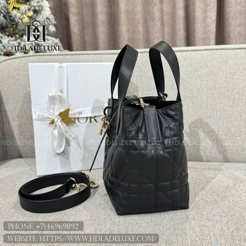 Design: Compact and effortlessly elegant, the CD Toujours Mini reinterprets classic house codes with a modern perspective. Its gently structured form and softly rounded base create a graceful silhouette that adapts to both formal and casual settings. The top handles and adjustable, removable leather strap allow the bag to be carried by hand, worn on the shoulder, or styled crossbody. A discreet magnetic flap closure secures the main compartment, which includes a flat pocket for small essentials. Decorative knotted side straps lend a touch of movement and subtle volume, while the gold-tone “C.D” charm offers a signature accent that completes the design with understated refinement.