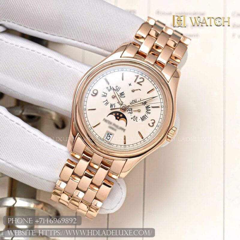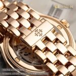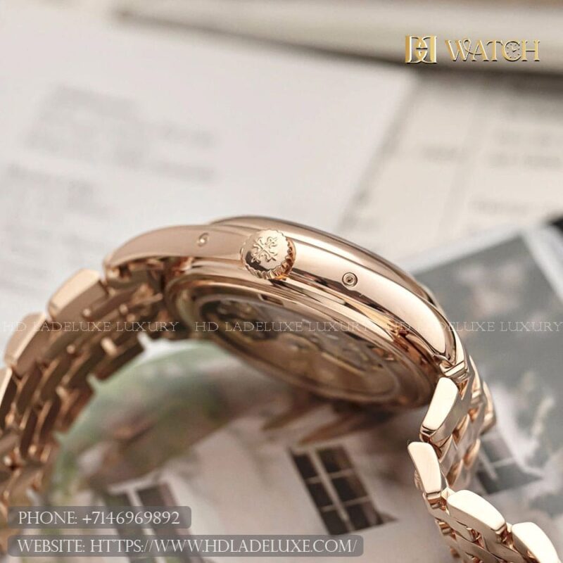 Case & Material: The PP Complications 5146/1R-001 is a refined embodiment of classic horology, crafted in 18k rose gold with a 39 mm case that balances timeless elegance and modern proportion. The polished surfaces and gently curved lugs highlight traditional craftsmanship, while the domed sapphire crystal provides exceptional clarity and durability. Water-resistant to 30 meters, the case maintains a slim and elegant profile on the wrist, perfect for formal and sophisticated settings. The solid rose gold bezel frames the dial beautifully, enhancing the watch’s warm and luxurious presence.