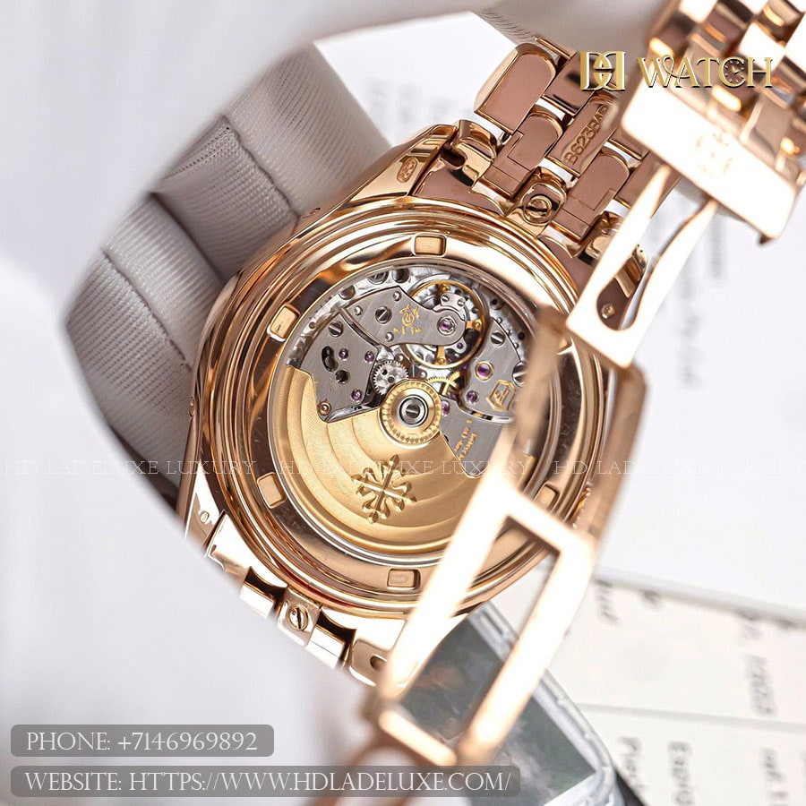 Movement: At the heart of the watch beats the automatic Caliber 324 S IRM QA LU, an advanced annual calendar movement renowned for its reliability and precision. It automatically accounts for months with 30 or 31 days, requiring only one adjustment per year in February. The movement features a 21k gold central rotor for efficient winding and delivers a 45-hour power reserve. Visible through the sapphire exhibition caseback, the caliber showcases traditional finishing techniques, including Geneva striping, polished bevels, and intricate perlage, exemplifying Patek Philippe’s commitment to haute horlogerie.