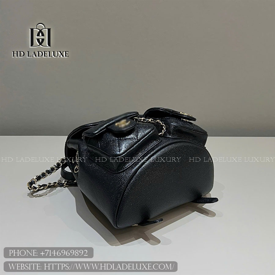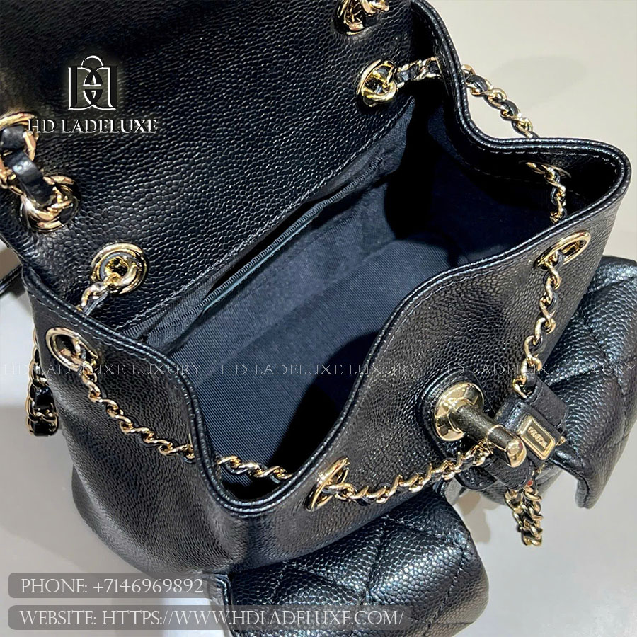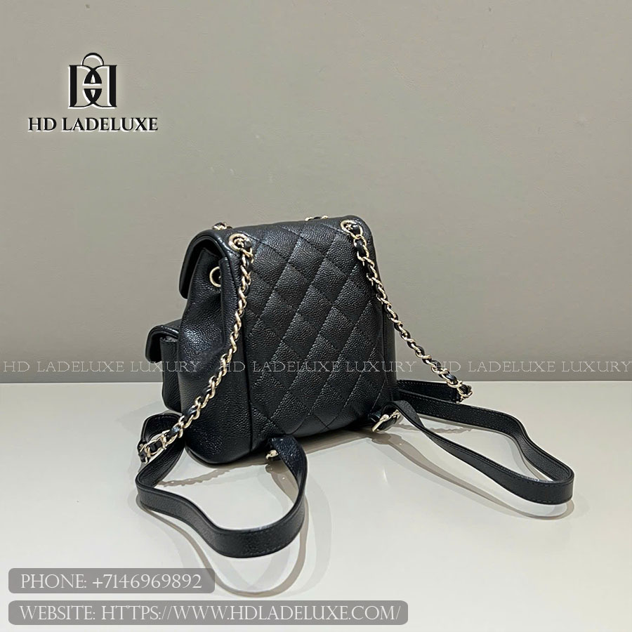 Material: The CC 23P Backpack is beautifully crafted from supple diamond-quilted lambskin, renowned for its smooth texture, natural luster, and elegant softness. The fine-grain surface gives the bag a refined appearance while maintaining resilience for everyday use. Accented with brushed gold-tone hardware—including the signature interlocking CC clasp and eyelet chain details—the piece radiates classic charm and subtle opulence. The interior is lined with smooth leather in a tone-on-tone finish, ensuring both luxury and practicality. Each stitch, seam, and edge is executed with precision, reflecting CC’s unwavering dedication to craftsmanship and timeless beauty.