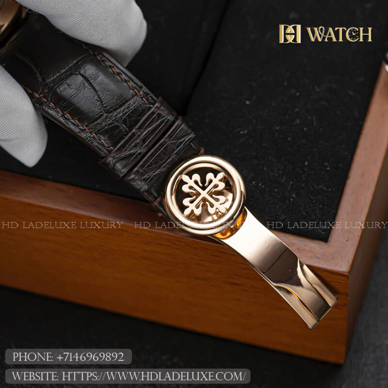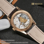 Bracelet: The watch is paired with a hand-stitched matte brown alligator leather strap that complements the warmth of the rose gold case. A matching 18k rose gold pin buckle secures the watch comfortably, ensuring a classic aesthetic and sophisticated fit.
