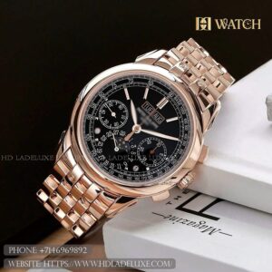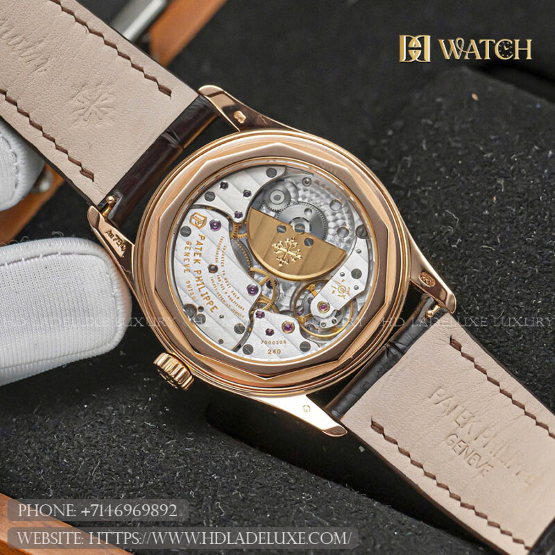 Movement: At the heart of the 6000R-001 beats the self-winding Caliber 240 PS C, a renowned ultra-thin movement with an integrated micro-rotor crafted from 22k gold. This ingenious design keeps the watch remarkably slim while delivering reliable automatic winding and a power reserve of approximately 48 hours. The movement’s exquisite finishing — including Geneva striping, polished bevels, and perlage — is visible through the sapphire exhibition caseback, exemplifying Patek Philippe’s mastery of fine watchmaking.