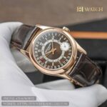 Dial & Display: The slate-gray sunburst dial with a subtle gradient finish is both contemporary and elegant, serving as a striking backdrop for the watch’s unique display. A decentralized subsidiary seconds dial at 4 o’clock adds visual interest, while a circular date track along the periphery is indicated by a red-tipped central hand — a distinctive design feature that sets the 6000R apart from traditional Calatrava models. Applied Arabic numerals and rose gold hands provide excellent legibility, and the overall layout achieves a delicate balance between classical refinement and modern flair.